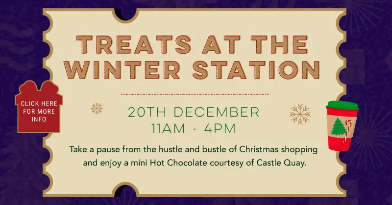 Time for a little Christmas indulgence! On Saturday 20th December between 11am – 3pm*, take a magical pit stop from your last-minute gift dash and treat the family at our Winter Treats Station at Castle Quay!